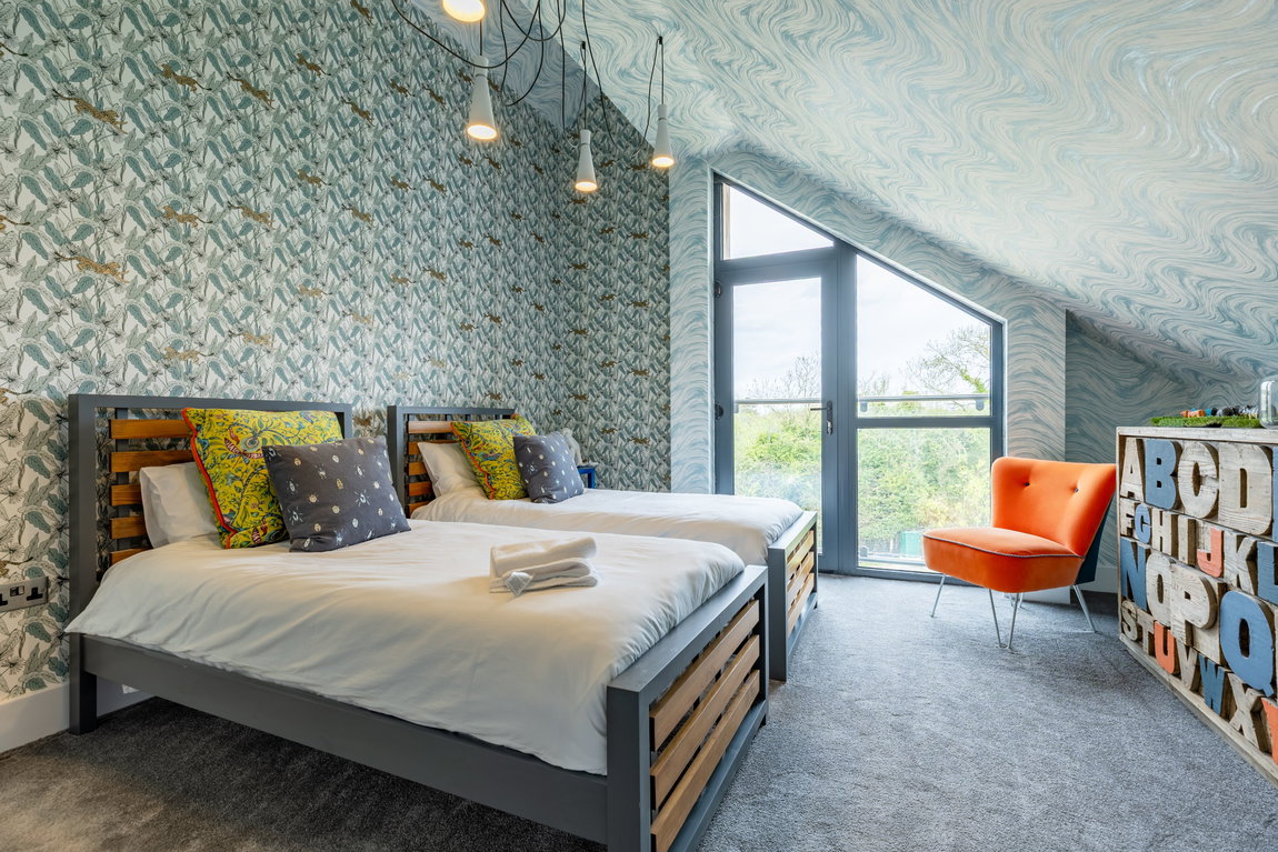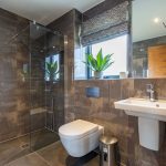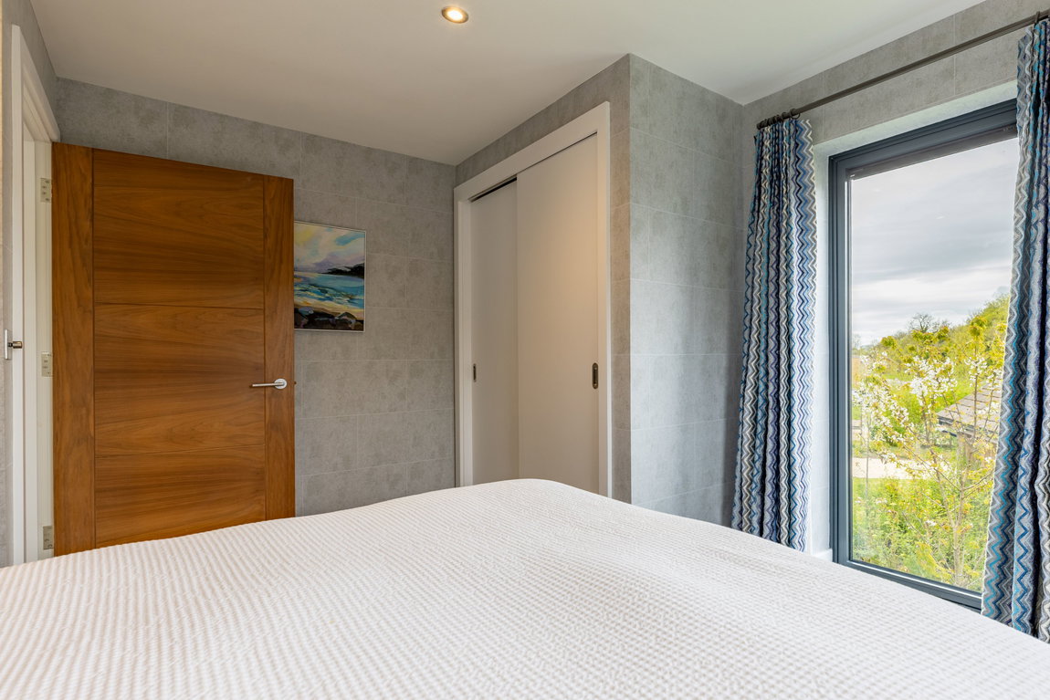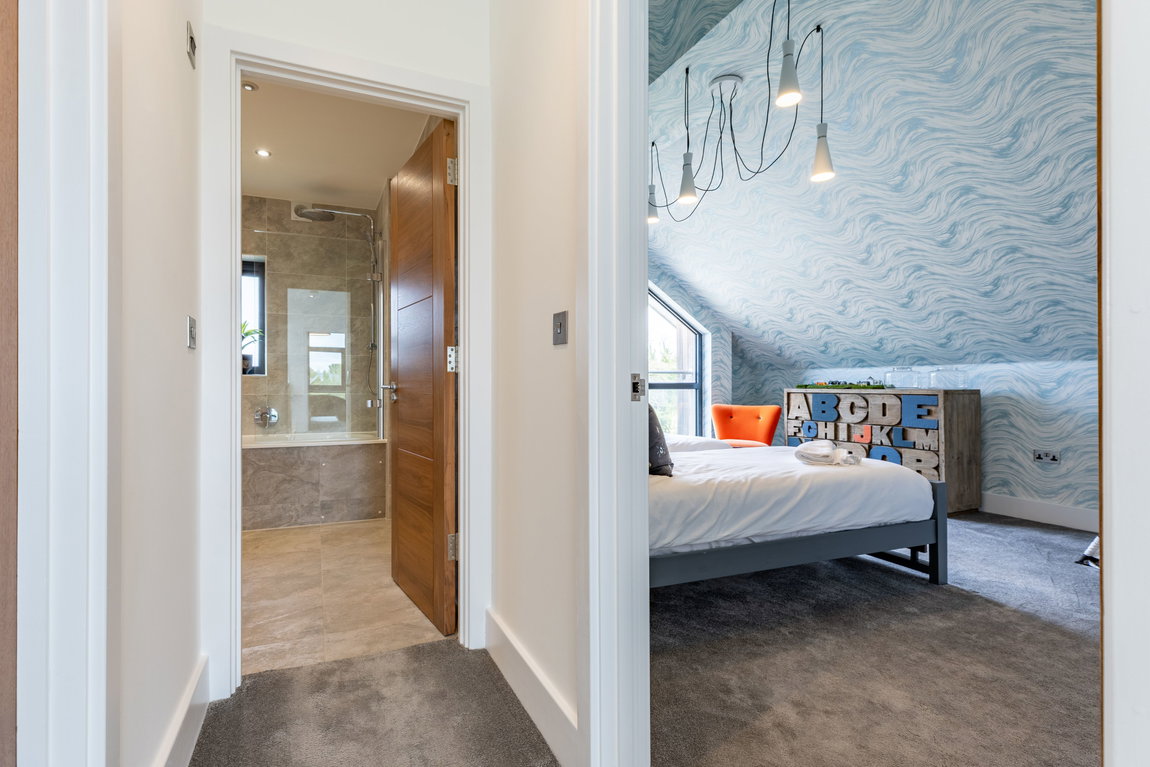 The fifth bedroom is equally well presented and currently arranged as a twin room, though easily adaptable to accommodate a king-size bed. Finished with stylish detailing and built-in storage, it offers flexibility for both family use and holiday letting. A further family bathroom on this level is finished to the same high standard, featuring a bath with shower over, wall-hung sanitaryware by Villeroy & Boch, and full tiling to both floors and walls.