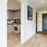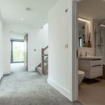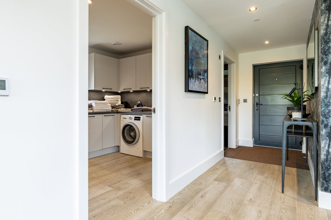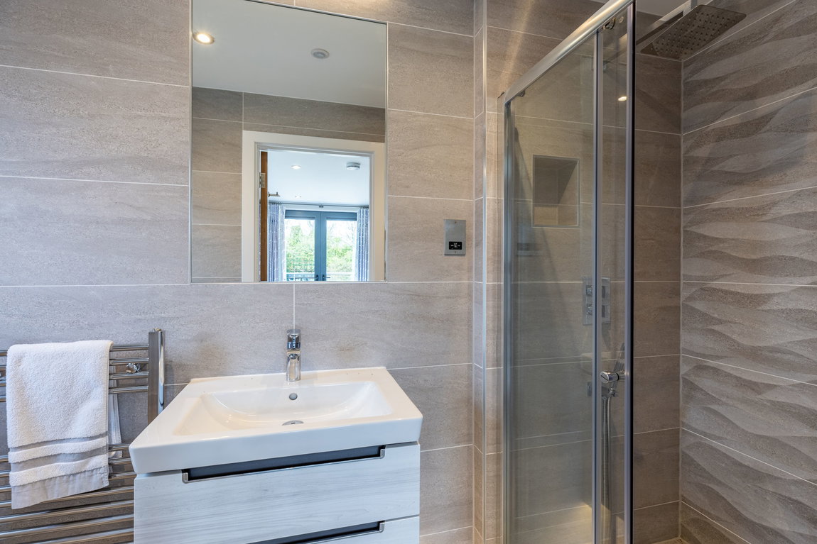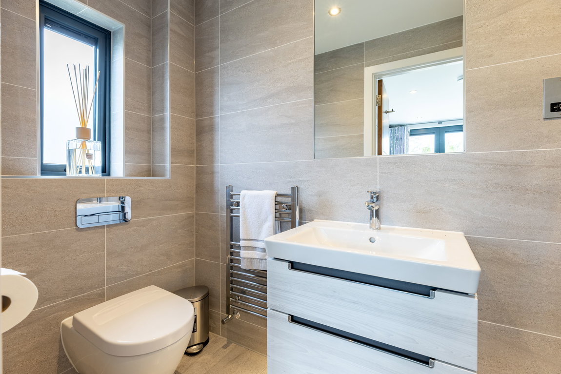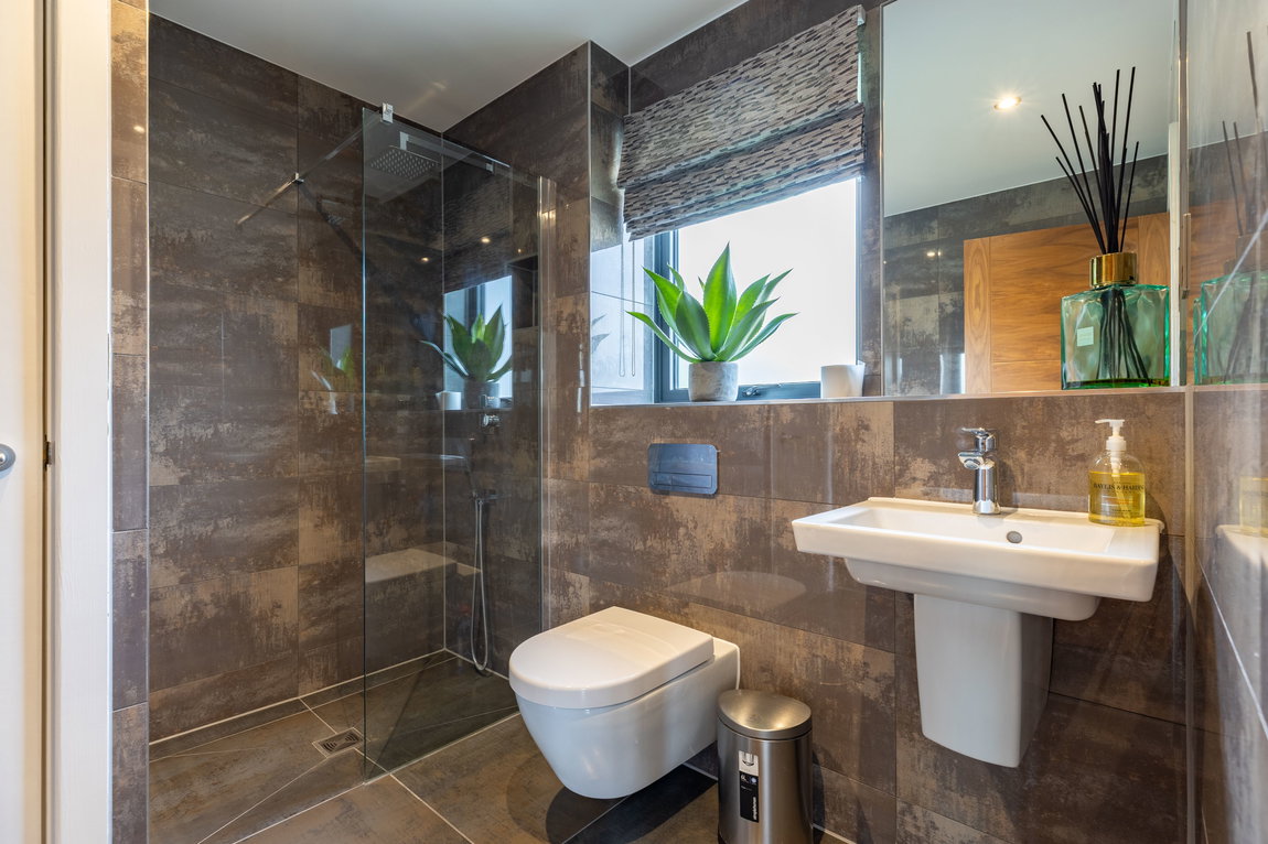 Immediately to the right of the entrance hall is a beautifully appointed shower room, finished with full tiling and contemporary wall-hung sanitaryware, offering a sleek, modern aesthetic alongside practical ease of maintenance.
