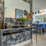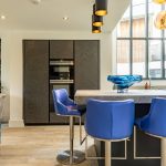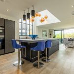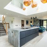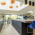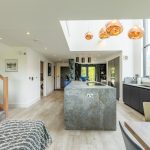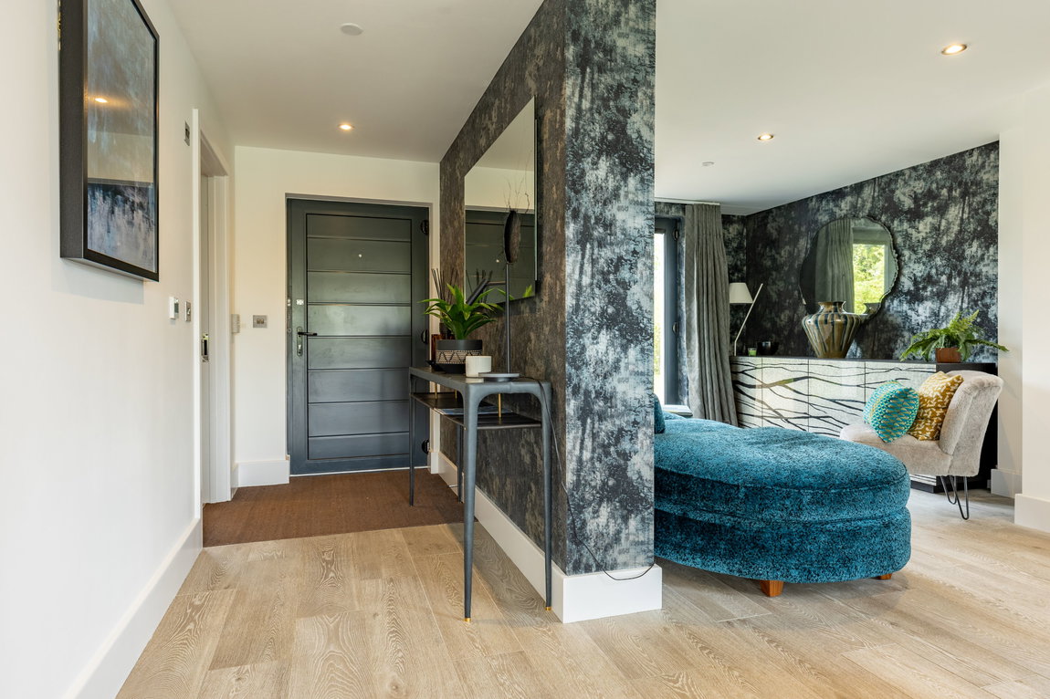 The hallway opens into an impressive open-plan living space, with the kitchen positioned at its centre beneath the striking double-height void. A statement lighting installation enhances the scale of the space, while to one side a stylish snug area offers a more intimate retreat, finished with distinctive feature wallpaper.