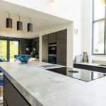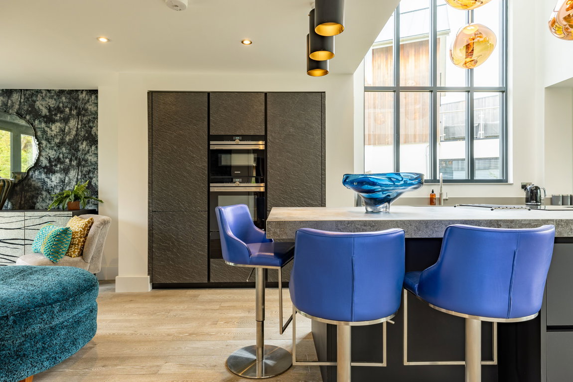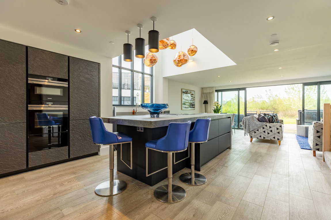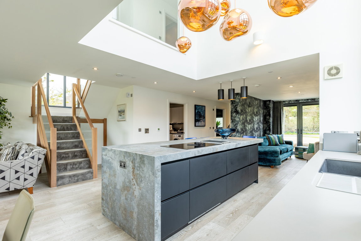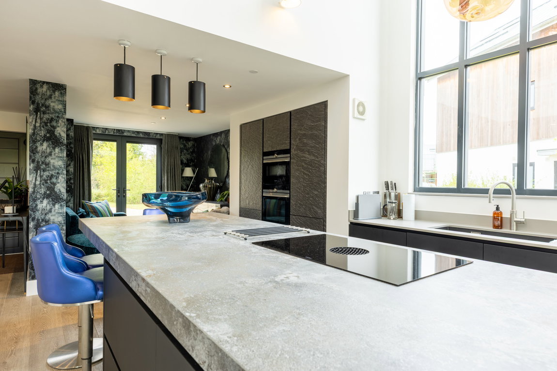 The kitchen itself is centred around a substantial island, finished with a stone-effect sintered worktop, combining refined aesthetics with exceptional durability - ideal for both everyday living and entertaining. The island incorporates a breakfast bar and an induction hob with integrated downdraft extractor, maintaining clean lines and uninterrupted sightlines across the space.