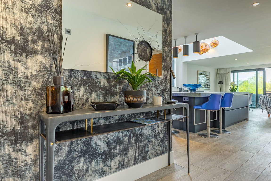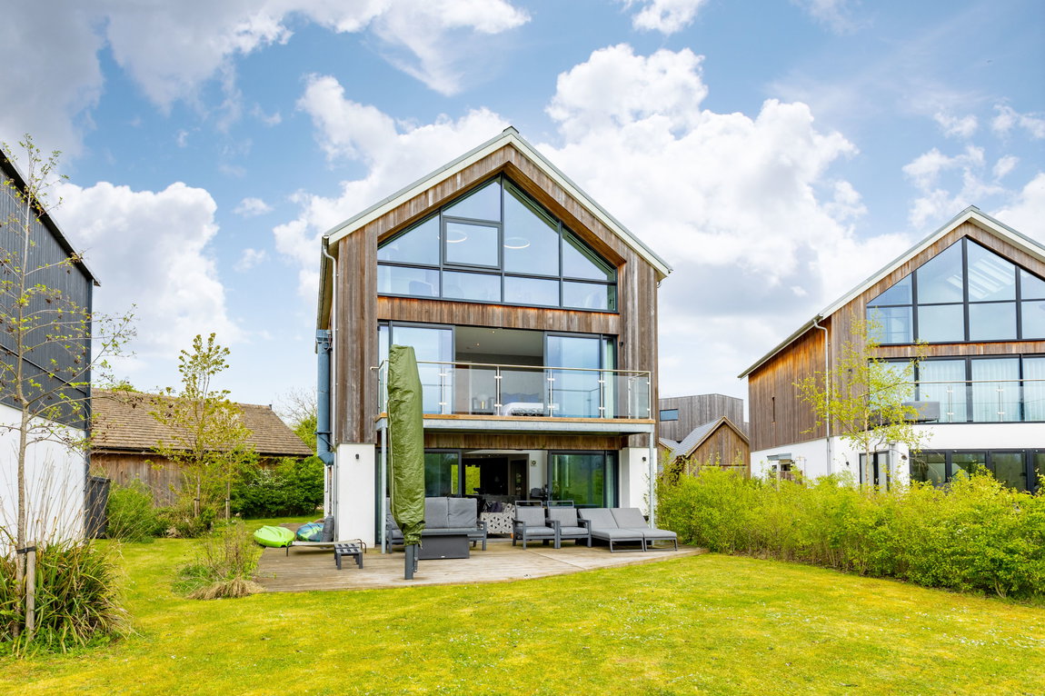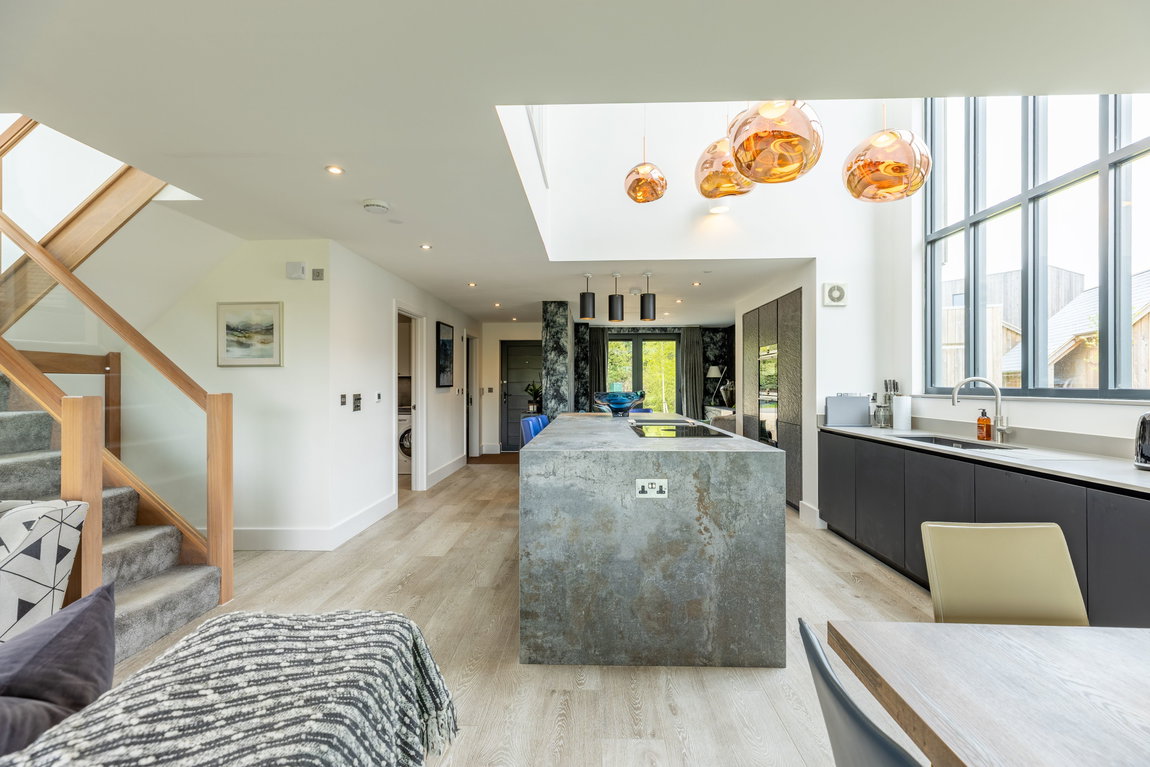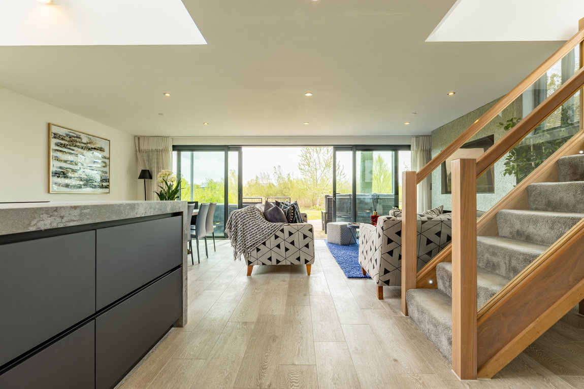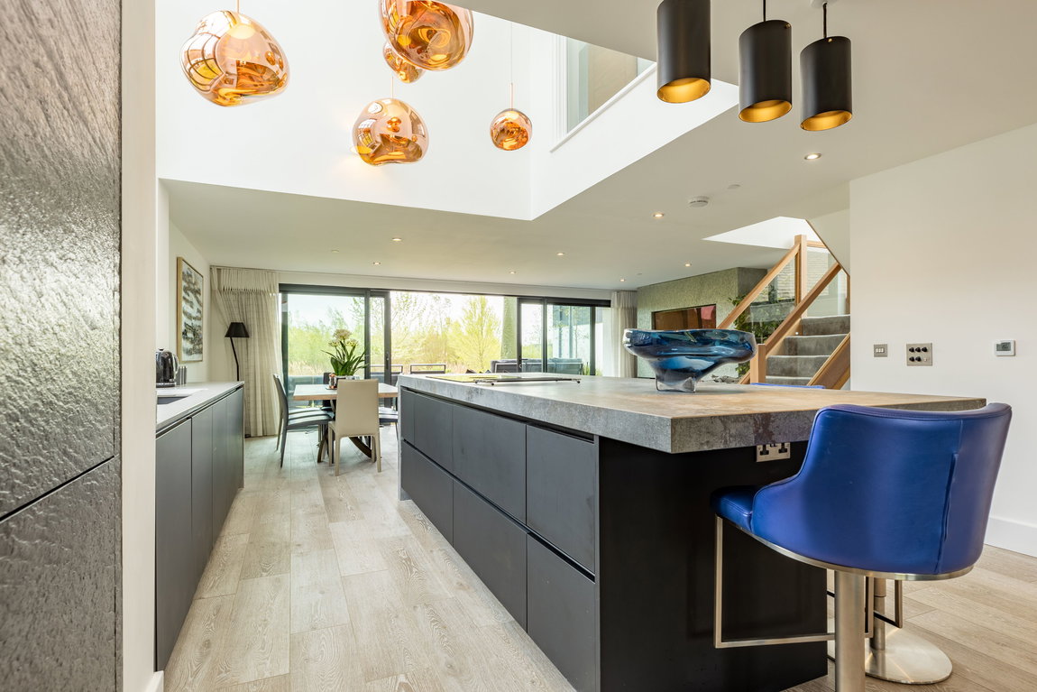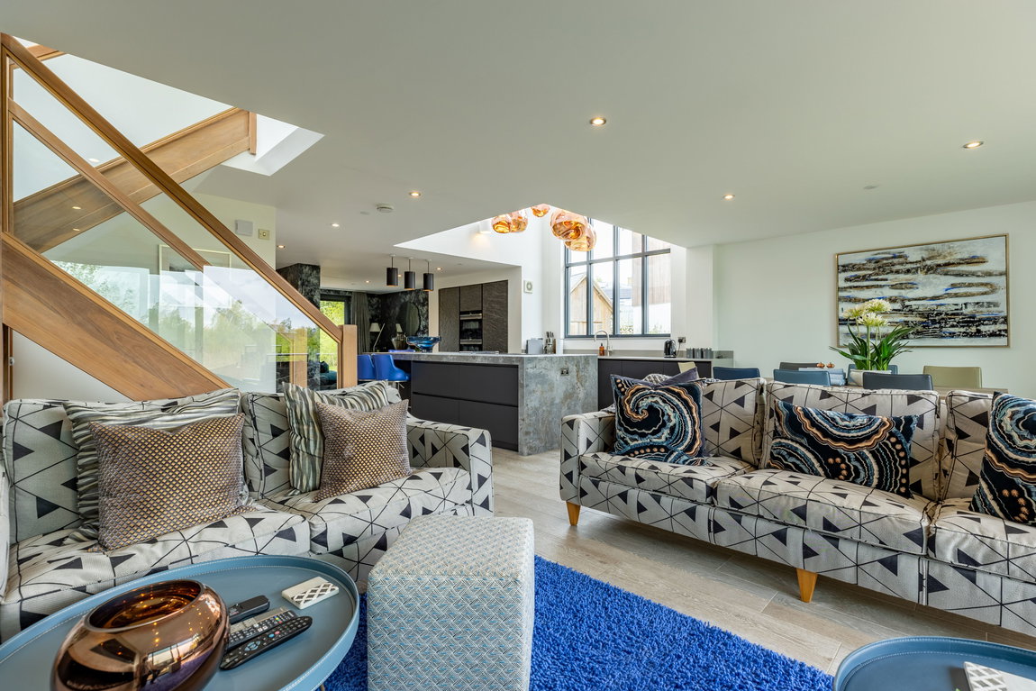Upon entering, the quality and design of the home are immediately apparent. Your eye is drawn through the space towards the lake beyond, with natural light flooding in through extensive glazing. At the heart of the design is a dramatic double-height glazed feature window within the kitchen, forming a striking architectural focal point and allowing light to pour through both the ground and first floors.