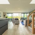 Large-format wood-effect porcelain tiling runs seamlessly throughout the ground floor, enhancing the sense of flow while providing a durable and elegant finish.
