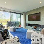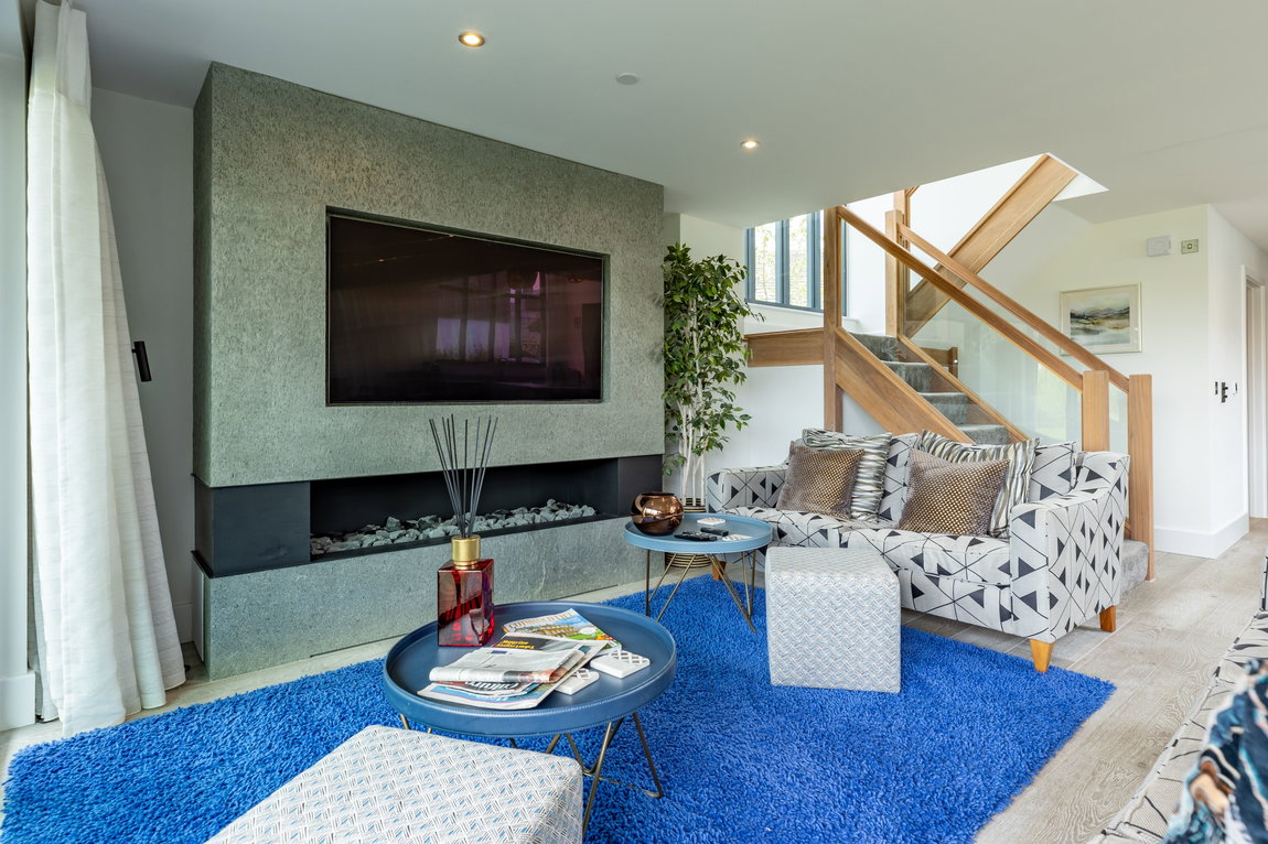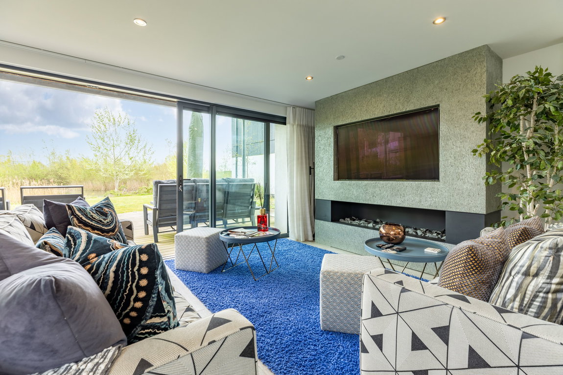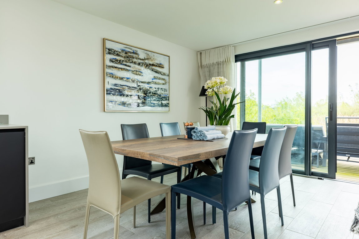 Flowing seamlessly from the kitchen, the space opens into the main living and dining area. The living space is centred around a bespoke built-in media unit with a 55-inch television and a stylish gas fireplace beneath, creating a warm and inviting environment. Large sliding glass doors frame views across Minety Lake and provide direct access to the sun deck and garden beyond.