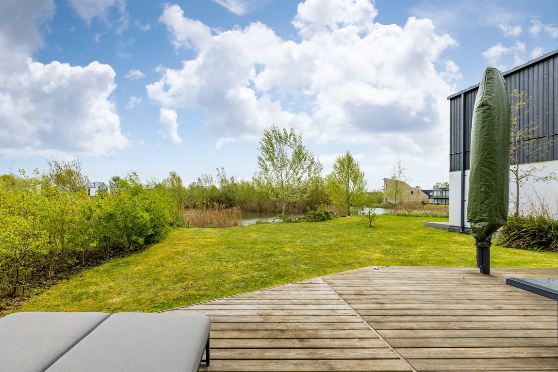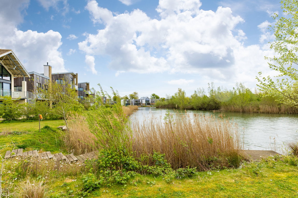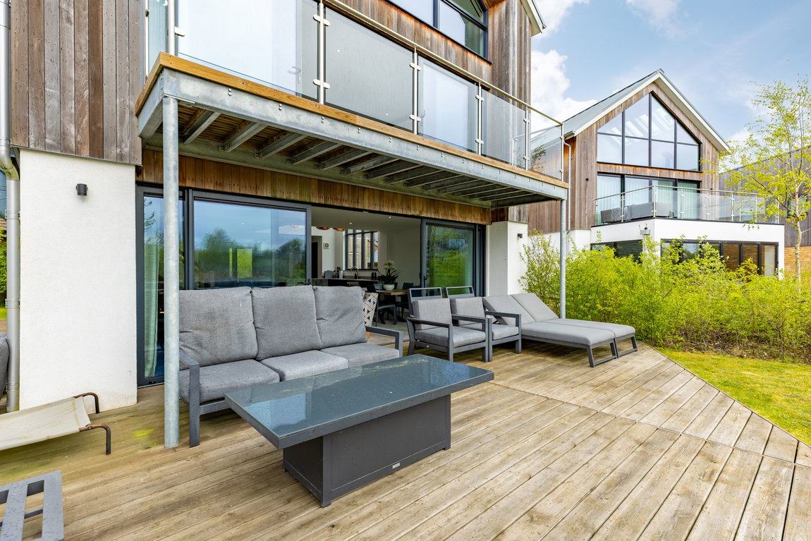 Outside, the property continues to impress. Sliding doors from the living area open onto a generous sun deck, creating a seamless transition between indoor and outdoor living — ideal for entertaining or simply enjoying the lakeside setting. Beyond, the gardens wrap around this larger-than-average corner plot, offering both space and privacy, along with direct access to the lake and convenient access to the boat store/garage.