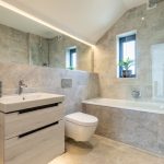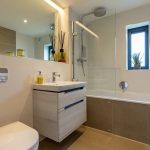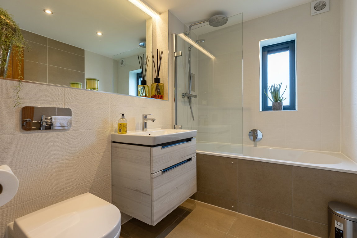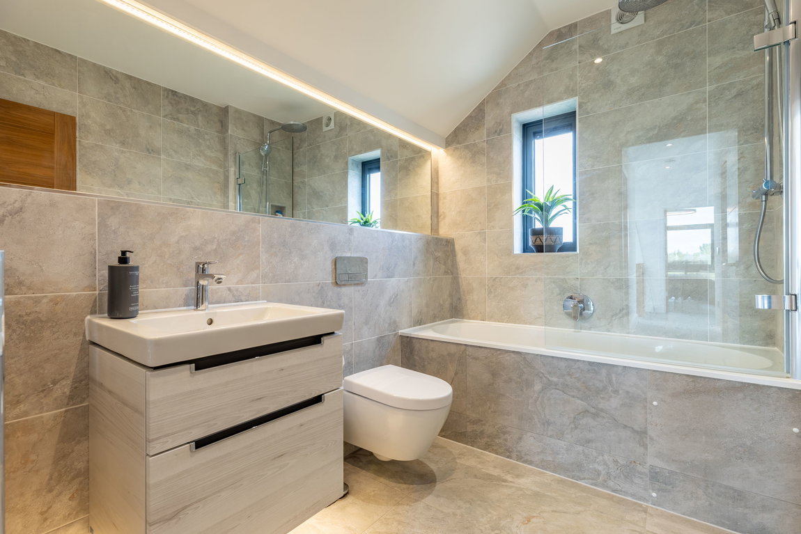 Also on this floor, the family bathroom continues the same level of specification, with wall-hung sanitaryware by Villeroy & Boch, full tiling and a bath with shower over.