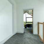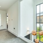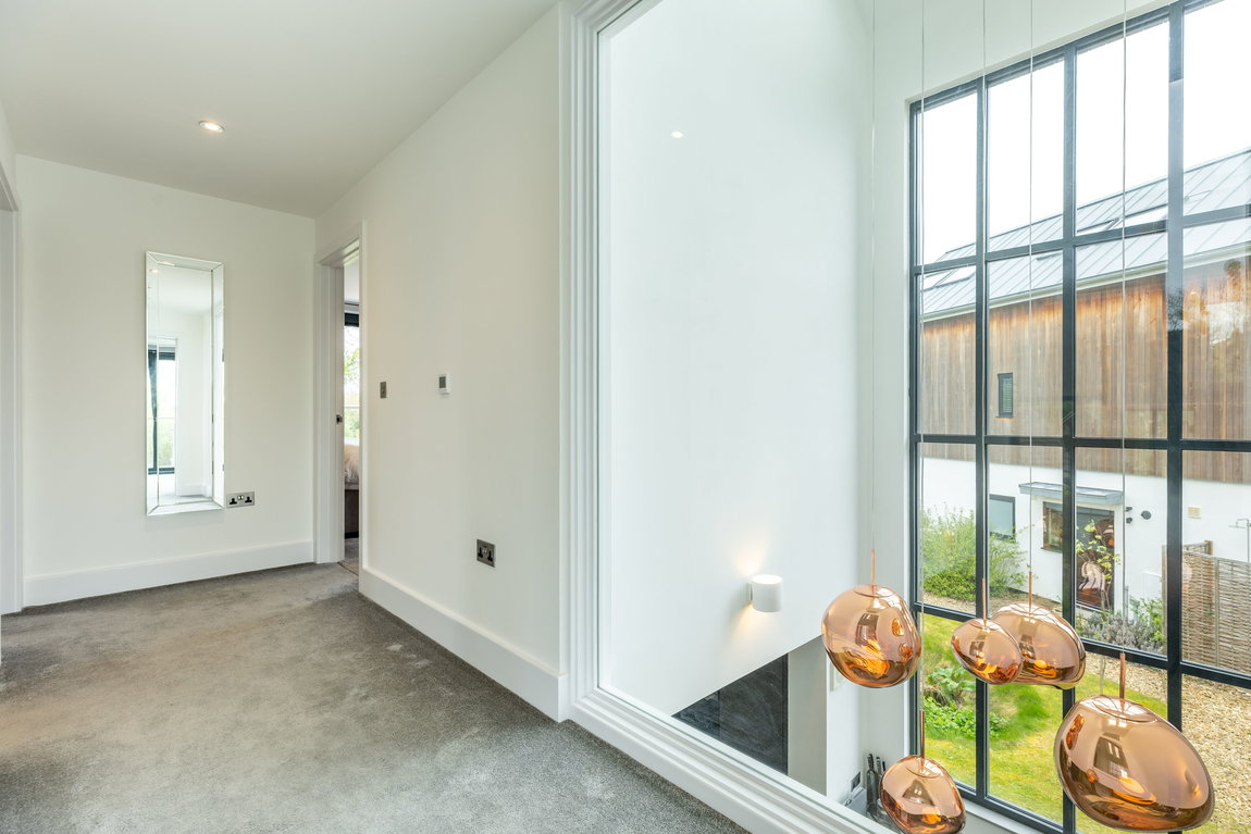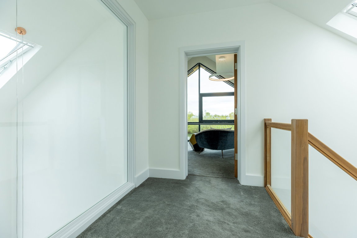 At the first-floor landing, a full-height internal glazed panel provides a unique perspective back through the dramatic double-height feature window within the kitchen below, reinforcing the architectural flow and openness that defines the home.