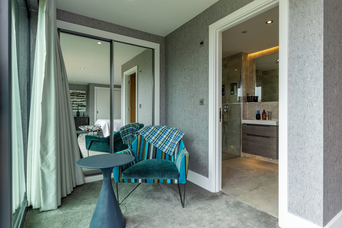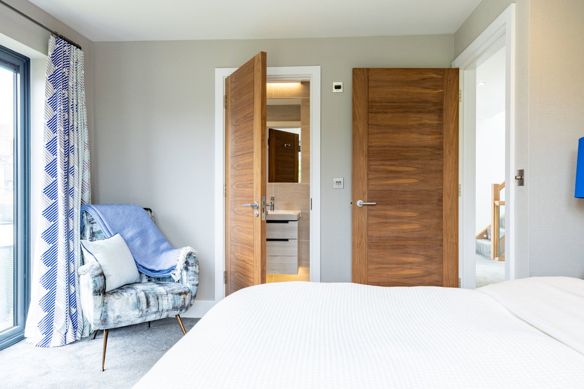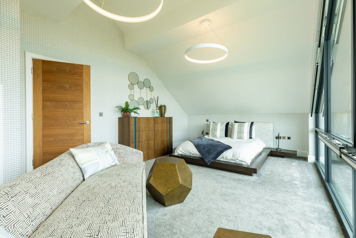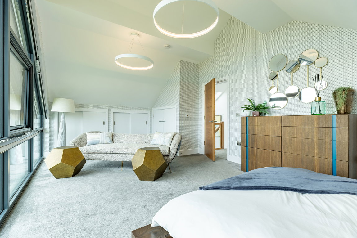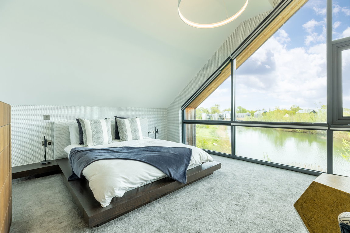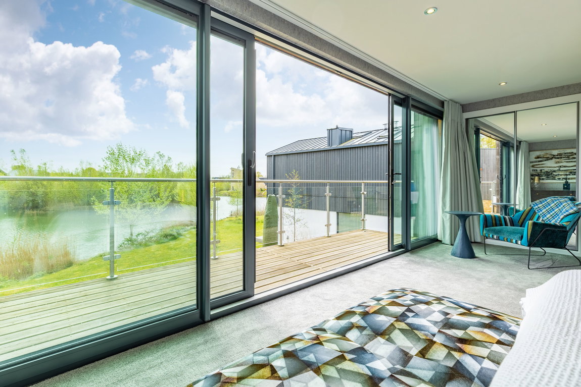The Master suite is another standout feature. Generously proportioned and beautifully finished, it enjoys far-reaching views across Minety Lake and the surrounding landscape, with direct access to a private sun terrace extending the full width of the property. The room is further enhanced by distinctive, high-quality finishes and built-in wardrobes.