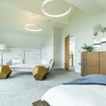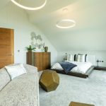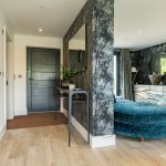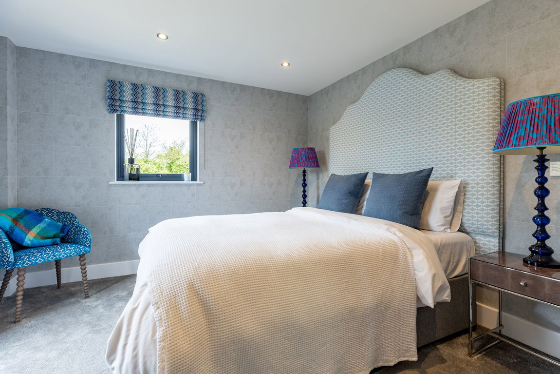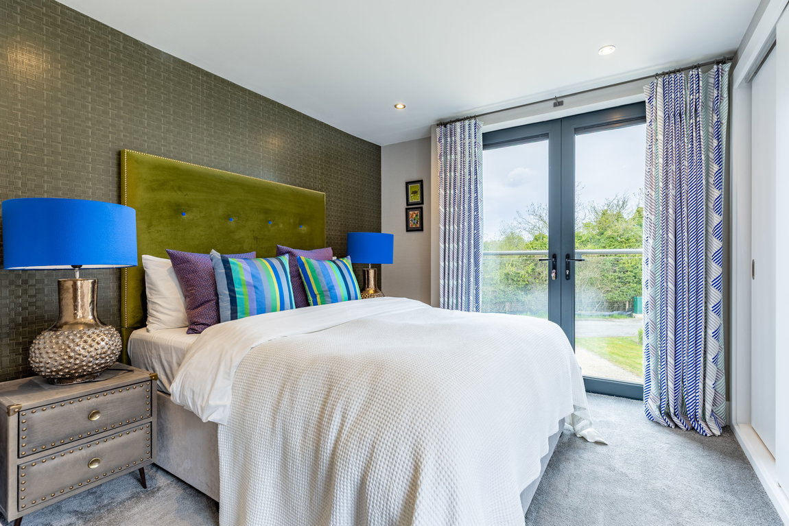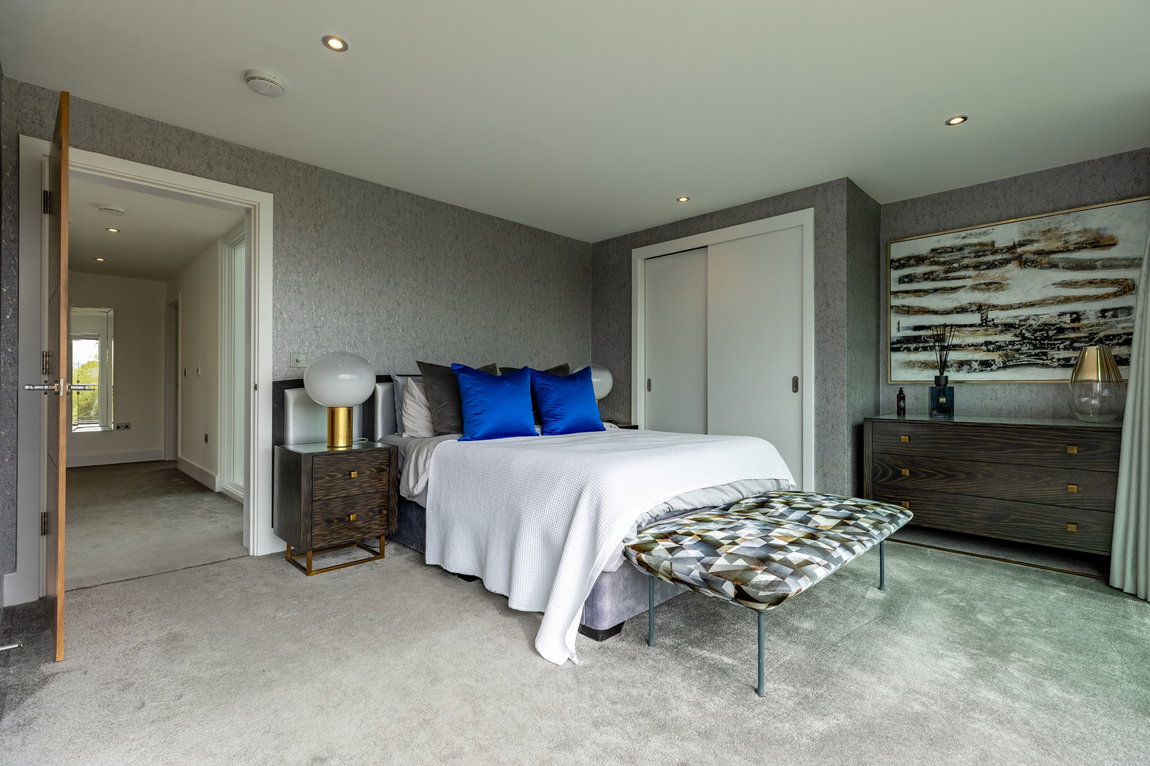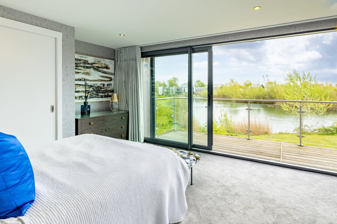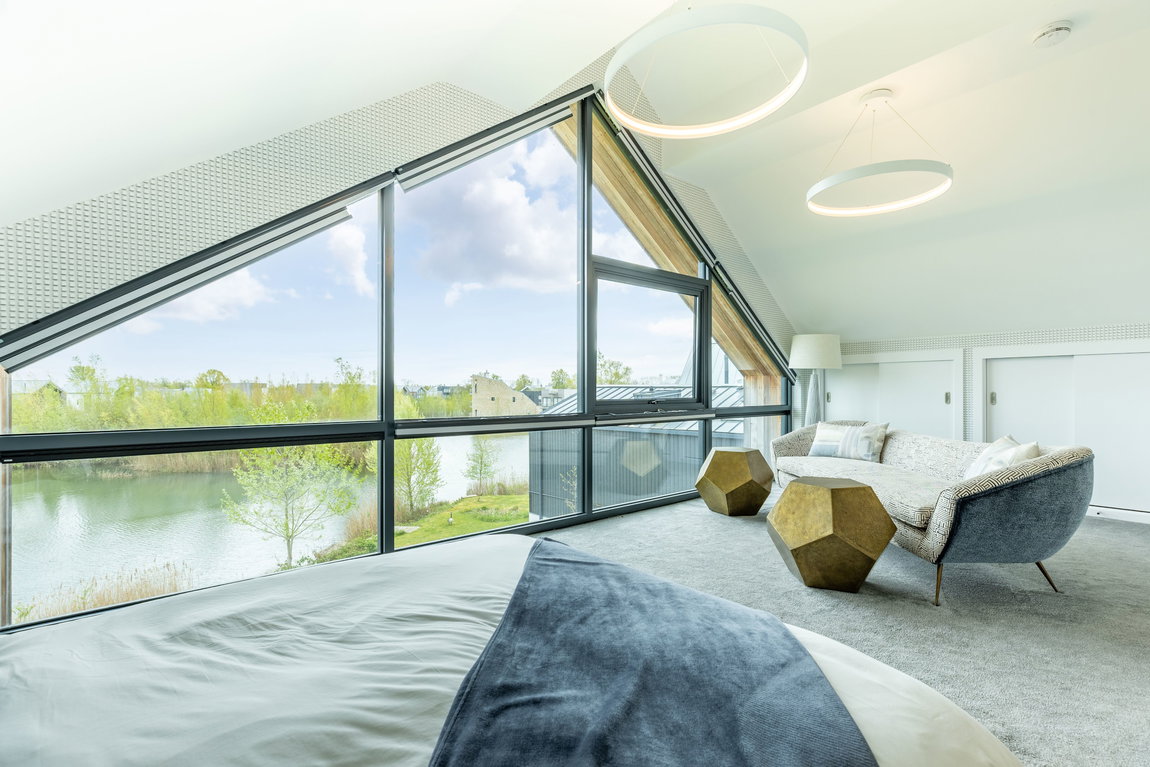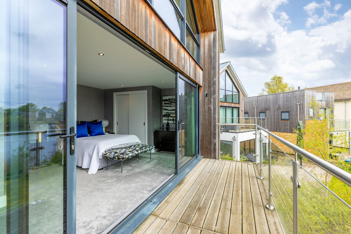 The Master suite is another standout feature. Generously proportioned and beautifully finished, it enjoys far-reaching views across Minety Lake and the surrounding landscape, with direct access to a private sun terrace extending the full width of the property. The room is further enhanced by distinctive, high-quality finishes and built-in wardrobes.