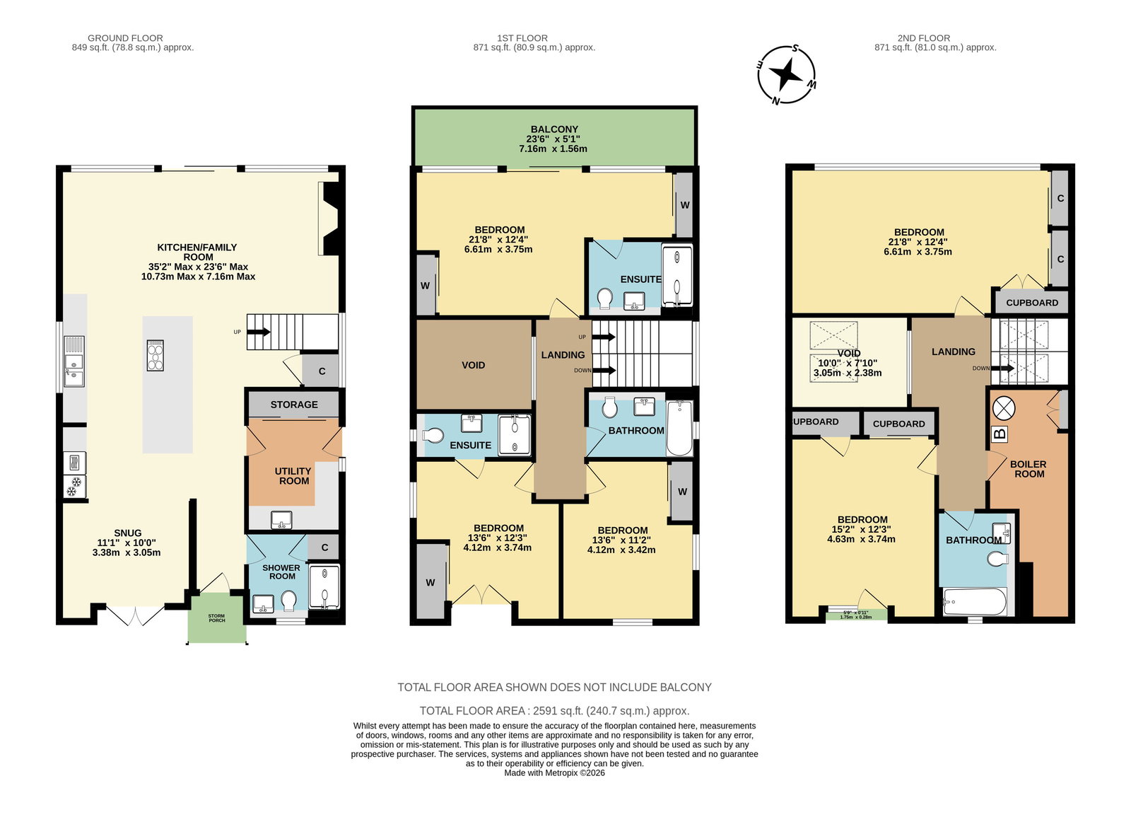 Two further generously sized double bedrooms are located towards the front of the property, one of which benefits from its own en-suite shower room, finished to the same high standard. The remaining bedroom is well served by the nearby family bathroom, effectively providing dedicated facilities given the en-suite arrangements elsewhere.